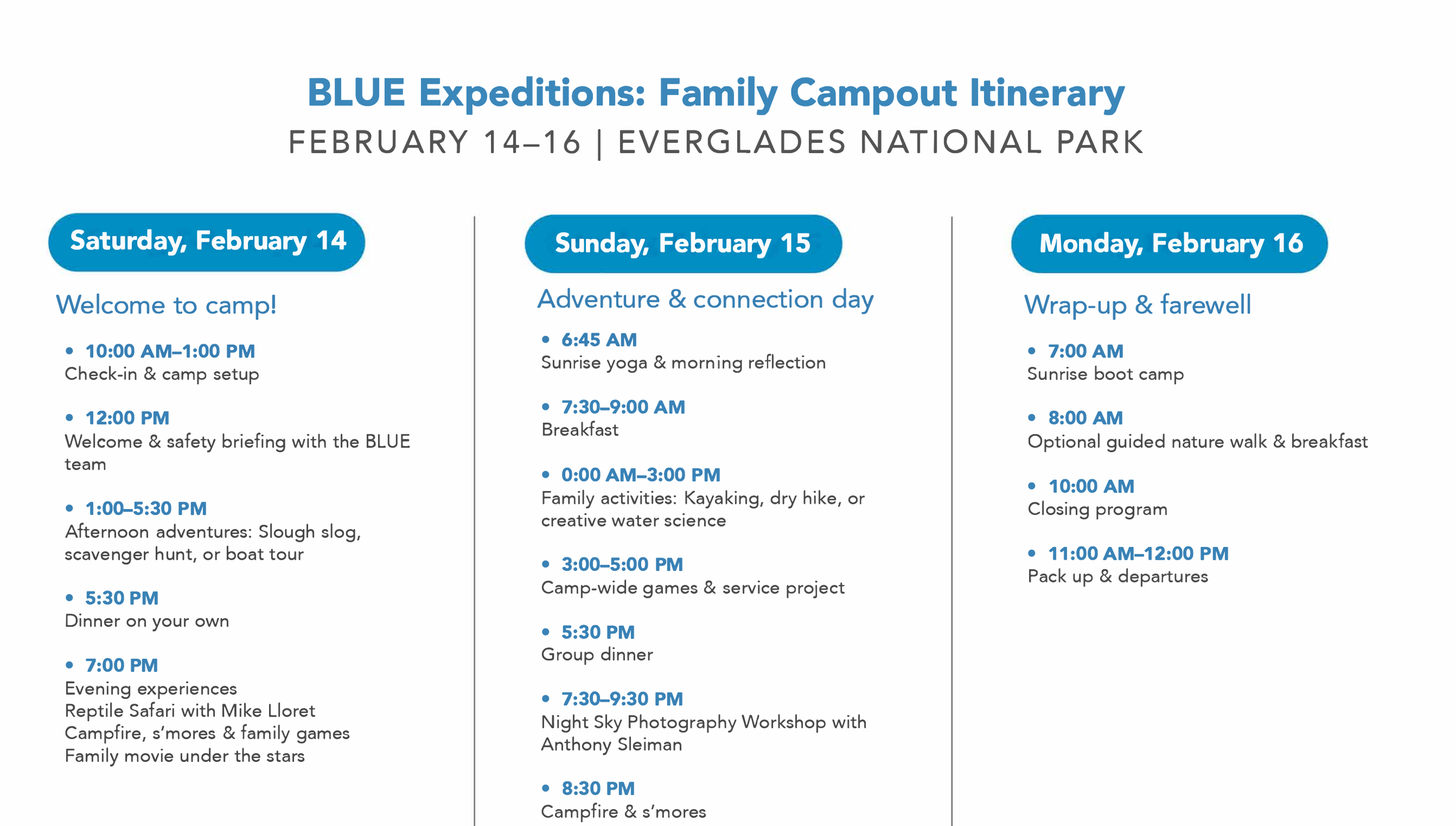 As a sponsor, your partnership will help create an unforgettable weekend of education, exploration, and service at Flamingo Campground in Everglades National Park. Together, we can inspire families to understand and protect the ecosystems that sustain us all.